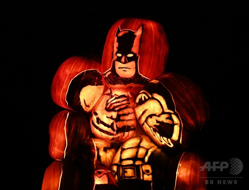 彫刻家らが約5000個の本物のカボチャを使い、映画のキャラクターや車などを模して手彫りで製作したジャック・オ・ランタンがライトアップされ、秋の夜の闇に浮かび上がった。(c)AFP
