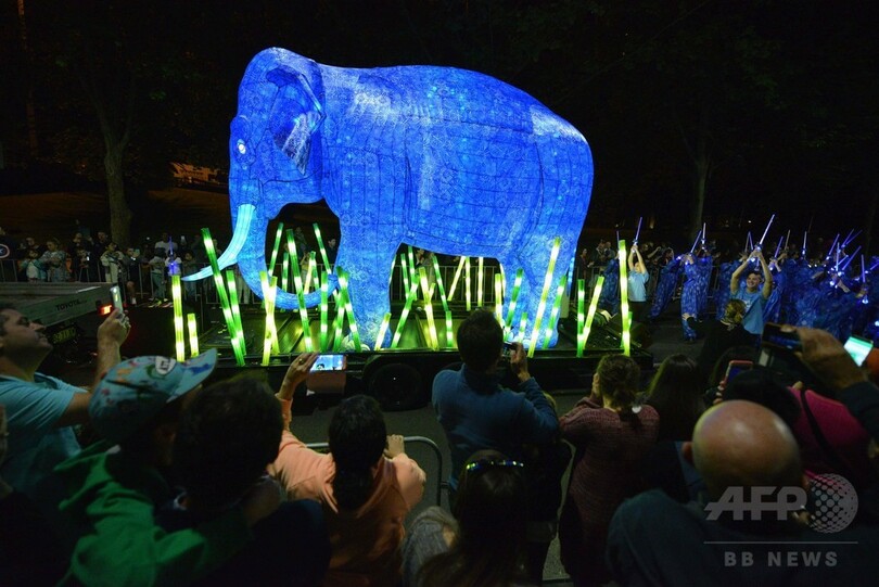 【10月18日 AFP】オーストラリア・シドニー(Sydney)で15日、タロンガ動物園(Taronga Zoo)の開園100周年を記念するパレードが開催された。同市中心部を練り歩くパレードでは、動物の保護における同園の功績をたたえ、アジアゾウなど絶滅が危惧される10種の動物をかたどった巨大なオブジェが登場した。(c)AFP