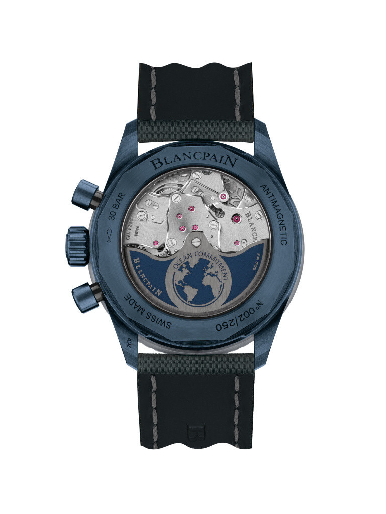 またフライバック機能により、4時位置のプッシュボタンを一回押すだけでクロノグラフをゼロにリセットし、再開することができる。ローターには、海洋探査と保全に対するブランパンのコミットメントを表す “Ocean Commitment” の文字がエングレービングされ、サファイアクリスタルのケースバックからは、この時計のスポーティーで洗練されたブリッジを見ることができる。