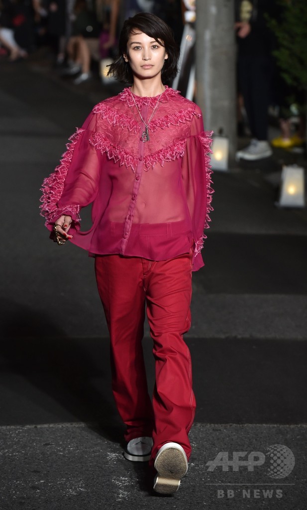 「パリのエナジーを東京のものと融合させたかった」とクリステルはショーの後の取材で語る。「2つの国のとてもパワフルで象徴的なつながりを表現し、我々は同じなのだと示したかった」(c)AFP/JENNIE MATTHEW