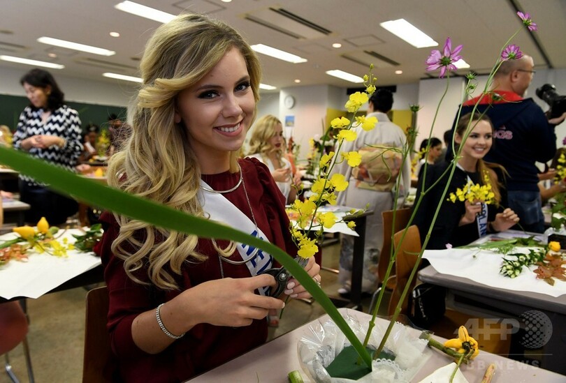 【10月21日 AFP】「ミス・インターナショナル・ビューティ・ページェント2016(Miss International Beauty Pageant 2016)」の各国代表らが21日、都内の華道家元・池坊(Ikenobo)東京会館で、いけばなを体験した。