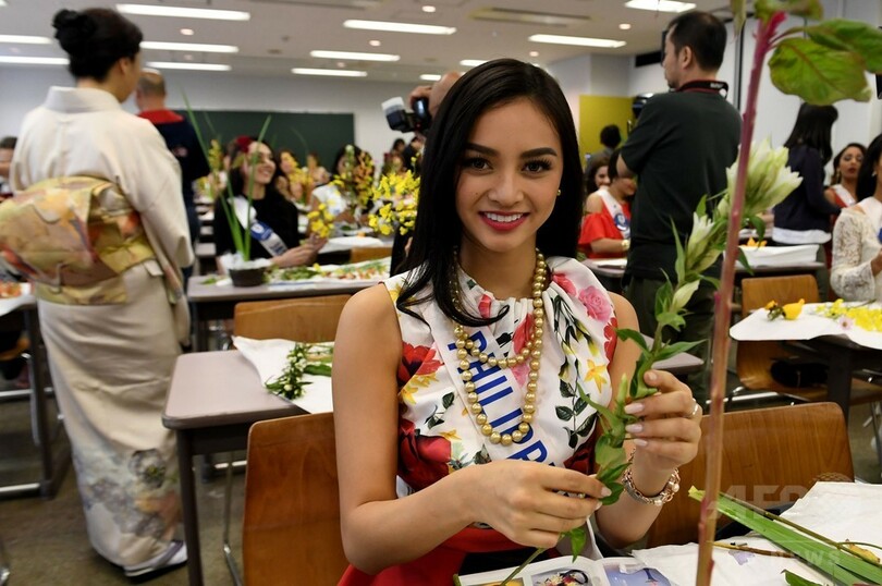 【10月21日 AFP】「ミス・インターナショナル・ビューティ・ページェント2016(Miss International Beauty Pageant 2016)」の各国代表らが21日、都内の華道家元・池坊(Ikenobo)東京会館で、いけばなを体験した。