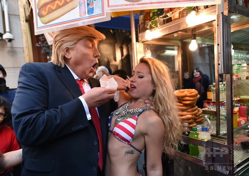 ビキニ姿のモデルがトランプ氏に抗議? 米NYにそっくりさん