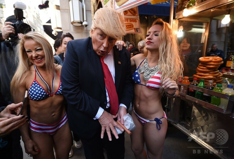 ビキニ姿のモデルがトランプ氏に抗議? 米NYにそっくりさん