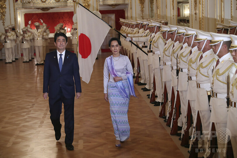 【11月3日 AFP】安倍晋三(Shinzo Abe)首相は2日、来日中のミャンマーの事実上の指導者、アウン・サン・スー・チー(Aung San Suu Kyi)国家顧問兼外相と会談した。首相は会談後の合同記者会見で、ミャンマーに向こう5年間で官民合わせ8000億円規模の支援を行うと表明した。