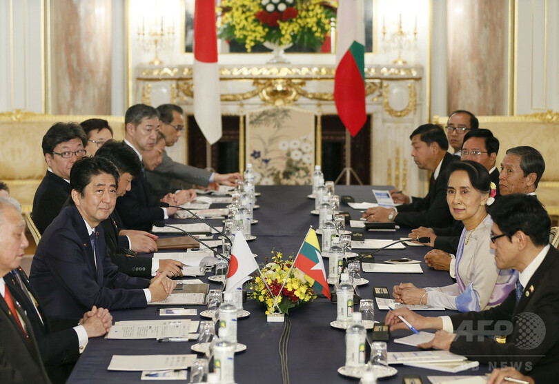 【11月3日 AFP】安倍晋三(Shinzo Abe)首相は2日、来日中のミャンマーの事実上の指導者、アウン・サン・スー・チー(Aung San Suu Kyi)国家顧問兼外相と会談した。首相は会談後の合同記者会見で、ミャンマーに向こう5年間で官民合わせ8000億円規模の支援を行うと表明した。