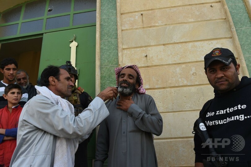 ISから解放されたモスル東端の村、バリカンで2年ぶりひげそり