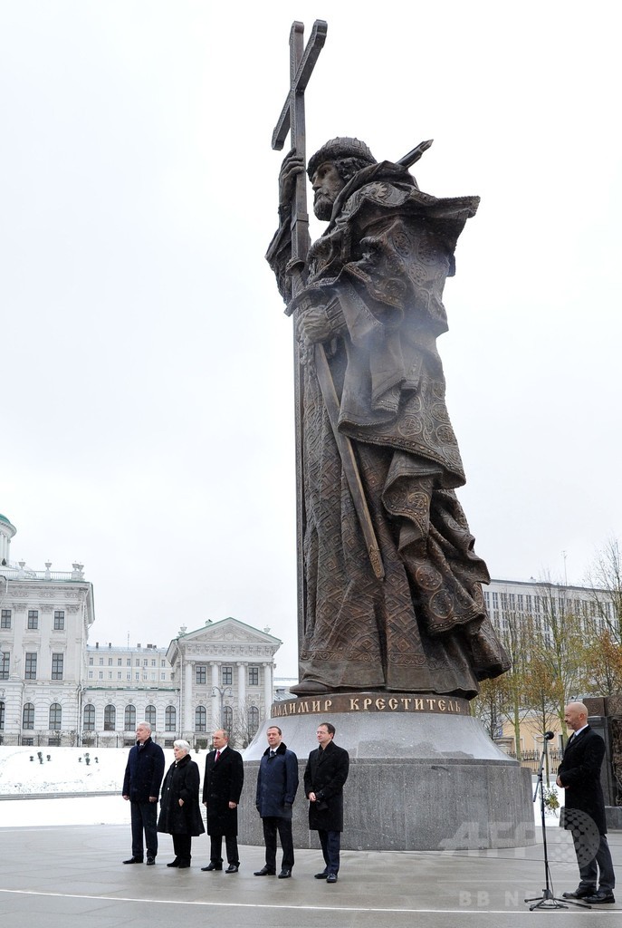 【11月5日 AFP】ロシアのウラジーミル・プーチン(Vladimir Putin)大統領は4日、クレムリン(Kremlin)の近くに建てられた自身と同名の歴史上の偉人でロシア正教会の聖人としてあがめられているウラジーミル大公(Vladimir the Great)の巨大な像の除幕式を行った。この像の設置をめぐり、地元住民や自然保護活動家からは批判の声が上がっていた。