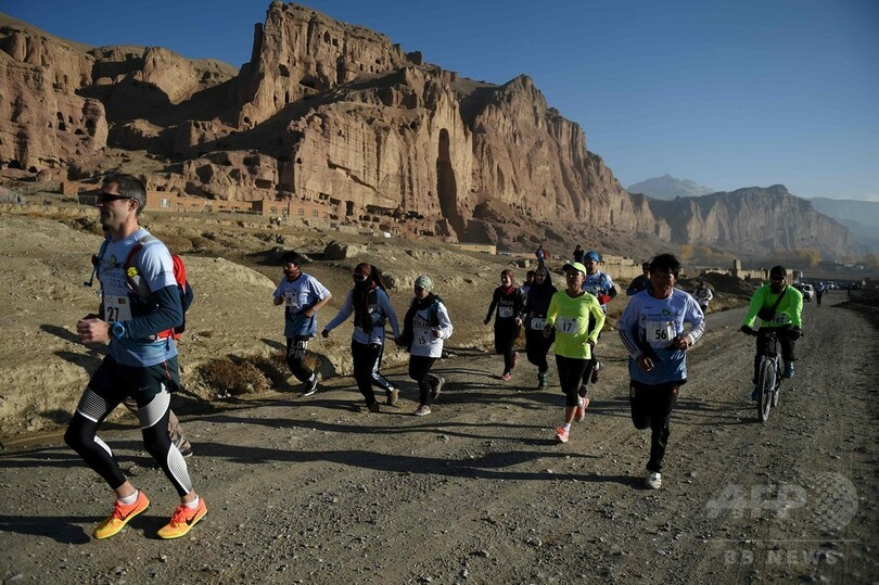 秋の肌寒さをものともせず、因習を打破するために、アフガニスタン人女性6人とイラン人女性1人を含む15人の女性たちが男性アスリートと肩を並べ、旧支配勢力タリバン(Taliban)が2001年に破壊した巨大な仏像がかつてたっていた断崖のふもとをスタートした。