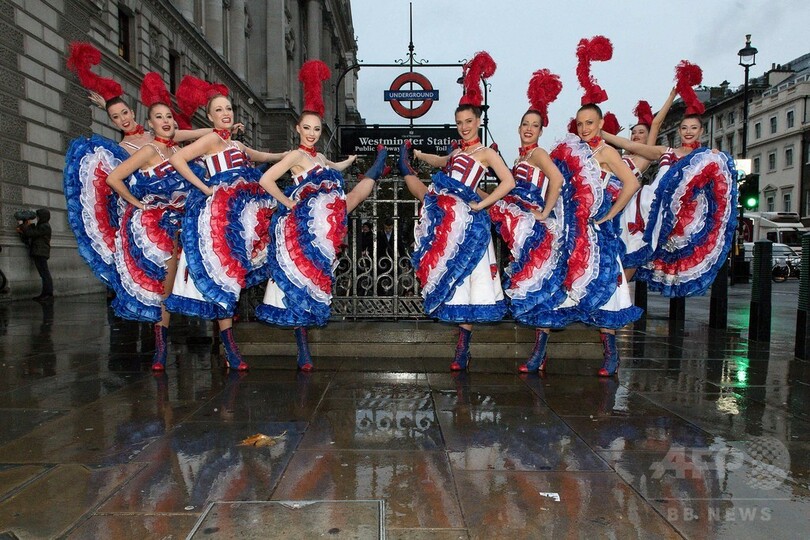 【11月7日 AFP】仏パリ(Paris)の老舗キャバレー「ムーランルージュ(Moulin Rouge)」の踊り子たちが4日、英ロンドン(London)でプロモーション活動を行い、ロンドンの象徴である「ビッグベン(Big Ben)」(英国会議事堂の時計台)や赤い電話ボックスを背景に華麗なダンスを披露した。(c)AFP