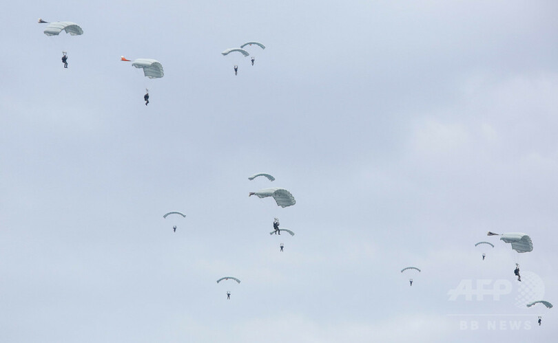 【11月8日 AFP】セルビアの首都ベオグラード(Belgrade)近郊のコビン(Kovin)で7日、ロシア、ベラルーシ、セルビアの3か国よる合同軍事演習「スラブの同胞(The Slavic Brotherhood)」が実施された。パラシュート部隊が降下訓練を行っていた最中には、空に鮮やかな虹が現れた。(c)AFP