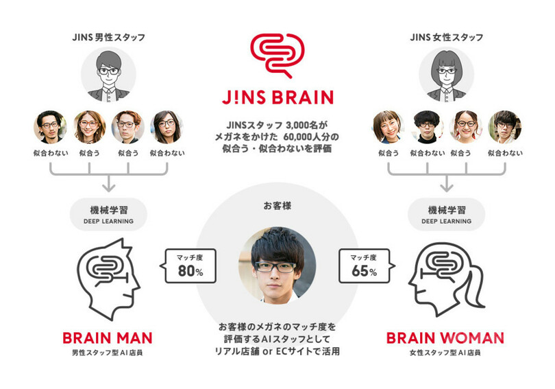 「ジンズ・ブレイン」には、実際に「ジンズ」スタッフ約3000人が、約6万枚に及ぶ画像データを評価したデータをもとに開発したオリジナルAIを搭載。パソコンやスマートフォンなどの端末からアップロードした顔写真に、眼鏡をバーチャル試着すると、それをもとに男性スタッフ型と女性スタッフ型の異なるAIが「マッチ度」を算出する。