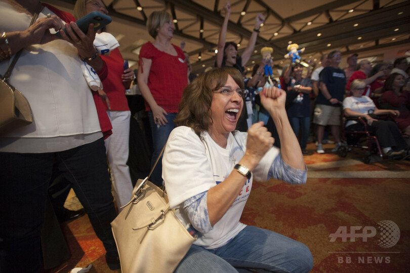 【11月9日 AFP】(写真追加)米大統領選挙は9日、共和党候補のドナルド・トランプ(Donald Trump)氏が民主党候補のヒラリー・クリントン(Hillary Clinton)氏に勝利し、全米各地をはじめ各国のトランプ氏支持者らが歓声を上げた。(c)AFP
