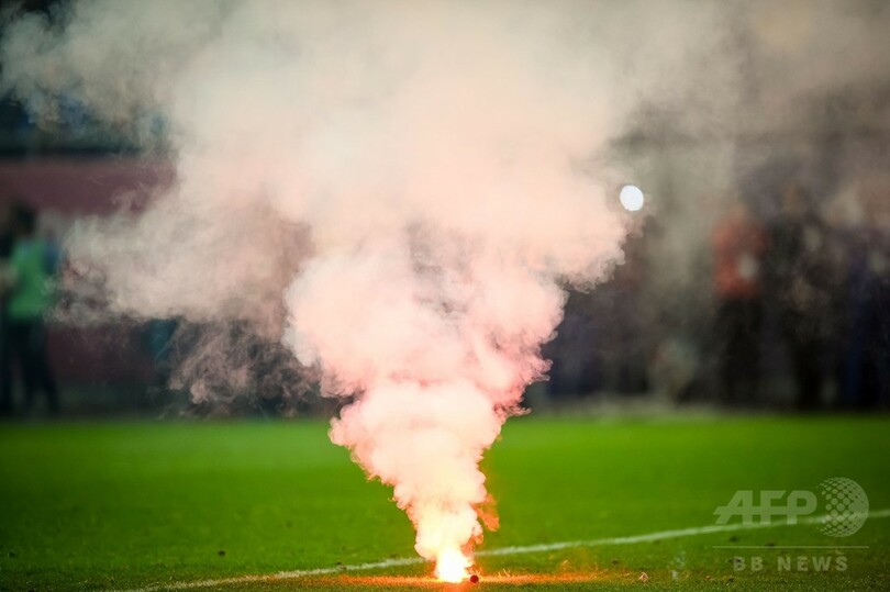 ドイツ・ブンデスリーガ1部バイエルン・ミュンヘン(Bayern Munich)に所属するレワンドフスキは後半8分、ルーマニアのファンがスタンドから投げ込んだ爆竹のようなものが自身の目の前で爆発すると、ピッチに倒れ込んだ。