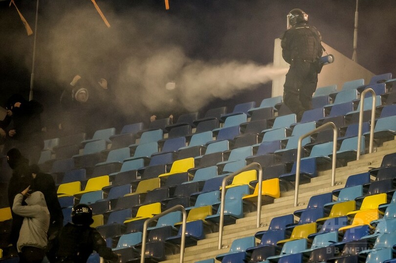 試合前には、街中のバーで暴力行為をはたらいたファンや、スタジアムの外で警察と衝突したポーランドのファン12人が逮捕されており、この試合には4000人の警察が動員された。(c)AFP