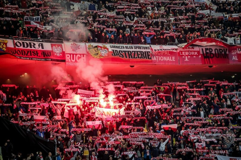 試合前には、街中のバーで暴力行為をはたらいたファンや、スタジアムの外で警察と衝突したポーランドのファン12人が逮捕されており、この試合には4000人の警察が動員された。(c)AFP