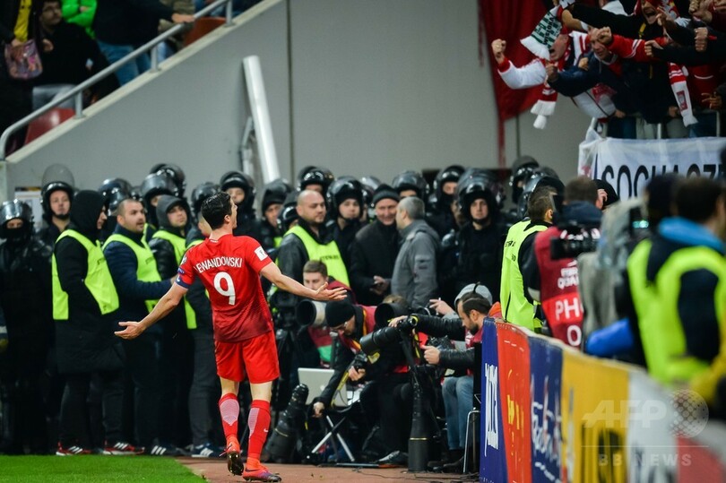 【11月12日 AFP】2018年サッカーW杯ロシア大会(2018 World Cup)欧州予選は11日、各地で行われ、グループEのポーランドは、観衆の投げた爆竹でエースのロベルト・レワンドフスキ(Robert Lewandowski)が倒れる場面がありながらも2得点を挙げる活躍をみせ、ルーマニアに3-0で勝利した。