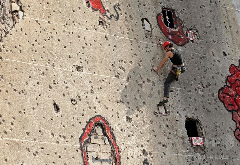 【11月14日 AFP】レバノンの首都ベイルート(Beirut)で、レバノン内戦(Lebanese Civil War、1975~1990年)中の砲撃や銃撃の痕が数多く残るビルの外壁を使い、スポーツクライミングの大会が行われた。参加者たちはビルの頂上を目指し、一番速いタイムを競い合った。(c)AFP