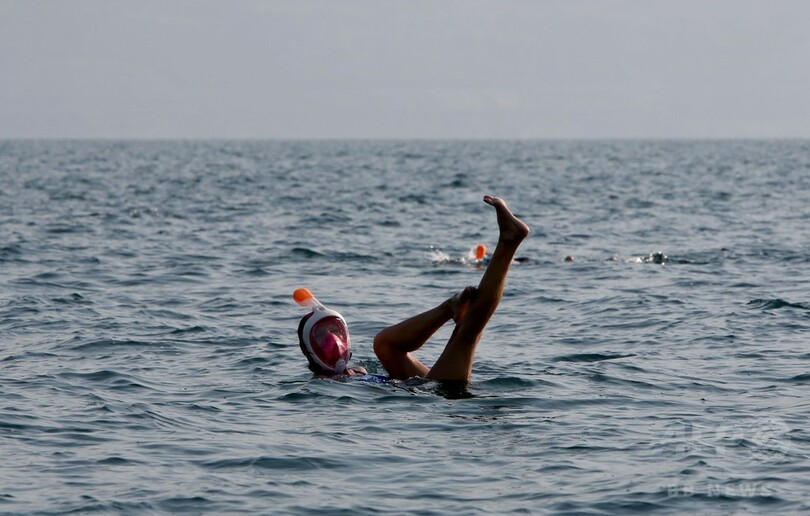 死海を泳いで横断、水位低下による消滅危機を啓蒙