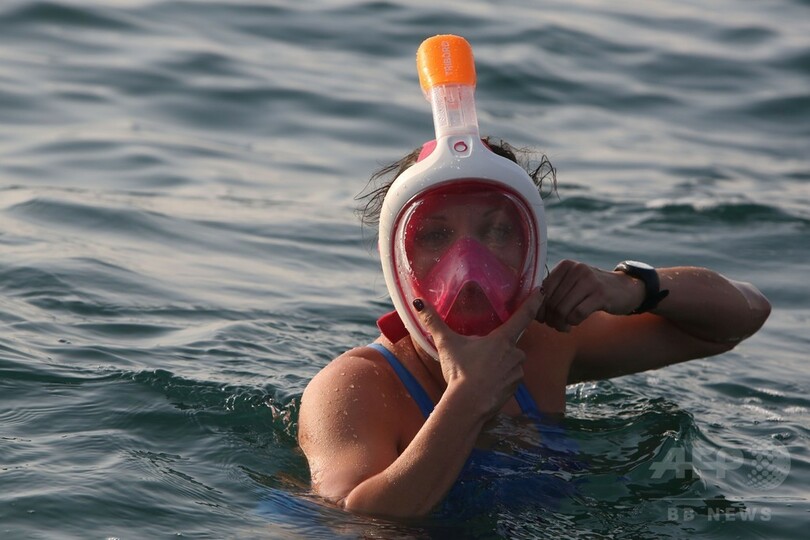 死海を泳いで横断、水位低下による消滅危機を啓蒙