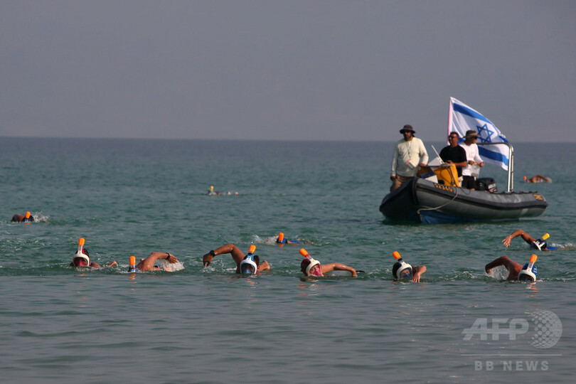 【11月16日 AFP】アラビア半島にある死海(Dead Sea)で15日、ヨルダンからイスラエルまでを泳いで横断するイベントが初めて開催され、塩分濃度の高い水の中を参加者たちが7時間かけて泳ぎ切った。