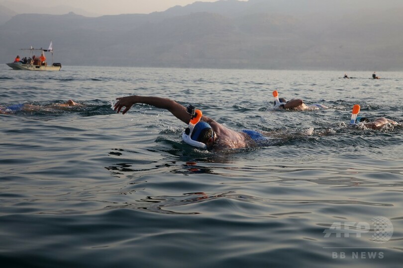 【11月16日 AFP】アラビア半島にある死海(Dead Sea)で15日、ヨルダンからイスラエルまでを泳いで横断するイベントが初めて開催され、塩分濃度の高い水の中を参加者たちが7時間かけて泳ぎ切った。