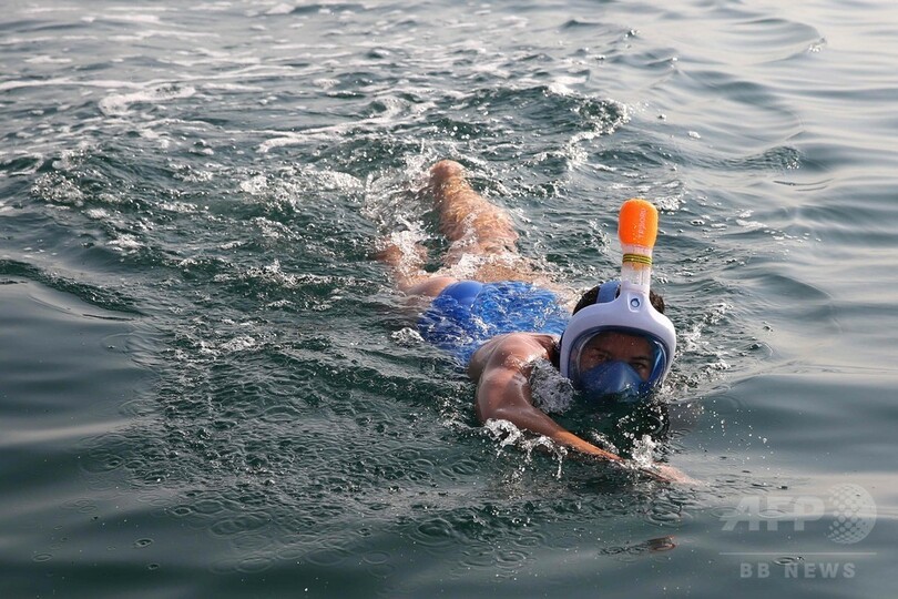 死海を泳いで横断、水位低下による消滅危機を啓蒙