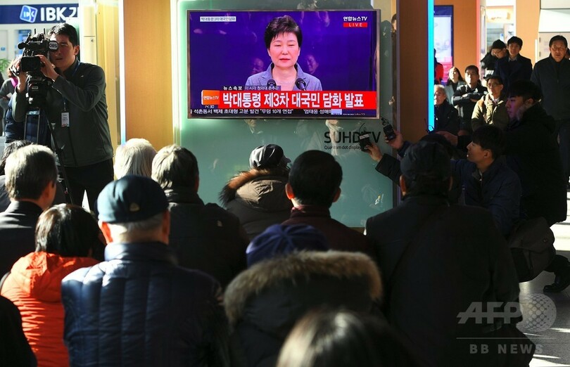 朴大統領は、テレビで生中継された談話で「任期短縮(の可能性)も含め、進退問題は国会の決定に委ねる」とし「政権の空白状態と国政の混乱を最小化するやり方で政権を移譲できる措置を国会で講じてもらえれば、私は大統領職から退く」と述べた。
