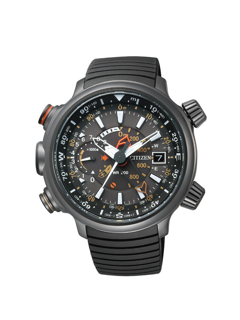 本格的なアウトドアウオッチ「エコ・ドライブ アルティクロン」とコラボレーションした「トゥモローランド」限定モデルでは、高度計測、方位測定など全ての機能はそのままに、ケース、バンド、文字板をブラックで統一。オレンジとゴールドの挿し色を効果的に配置し、ジャケットやニットなど幅広くコーディネートしやすいカラーリングに仕上げた。また、ケースはシチズン独自の素材「スーパーチタニウム TM」でキズに強く、ステンレスより約40%軽く仕上がっている。