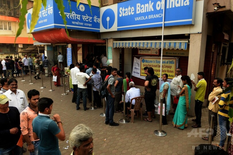 ナレンドラ・モディ(Narendra Modi)首相は11月8日、脱税と汚職の対策として現行の500ルピー(約800円)札と1000ルピー(約1600円)札を法定通貨から除外すると発表。その後、インド各地の銀行などでは旧紙幣を新紙幣に交換しようという人々が長蛇の列を作ったり、銀行が現金不足に陥ったため政府が現金引き出し額を制限したりするなどの混乱が続いている。(c)AFP/Abhaya SRIVASTAVA