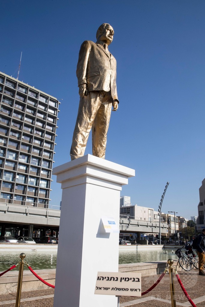 【12月7日 AFP】イスラエル・テルアビブ(Tel Aviv)の市庁舎前にあるラビン広場(Rabin Square)に6日、ベンヤミン・ネタニヤフ(Benjamin Netanyahu)首相の金色の像が出現した。高さは4メートルあり、6日未明にかけて許可なく設置され、数時間後に撤去された。