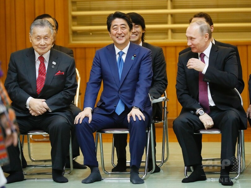 講道館でプーチン大統領は安倍首相や、五輪金メダリストで現在、全日本柔道連盟の副会長を務める山下泰裕(Yasuhiro Yamashita)氏らと柔道の演武を見学した。(c)AFP