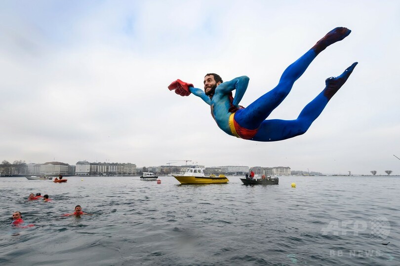 【12月19日 AFP】スイス・ジュネーブ(Geneva)のレマン湖(Lake Geneva)で18日、今年78回目となる毎年恒例の寒中水泳大会「クリスマス・カップ(Coupe de Noel)」が開催され、1800人以上が参加した。水温7度の凍てつく水の中、スーパーマンなどに扮(ふん)した参加者らが120メートルのコースに挑んだ。(c)AFP
