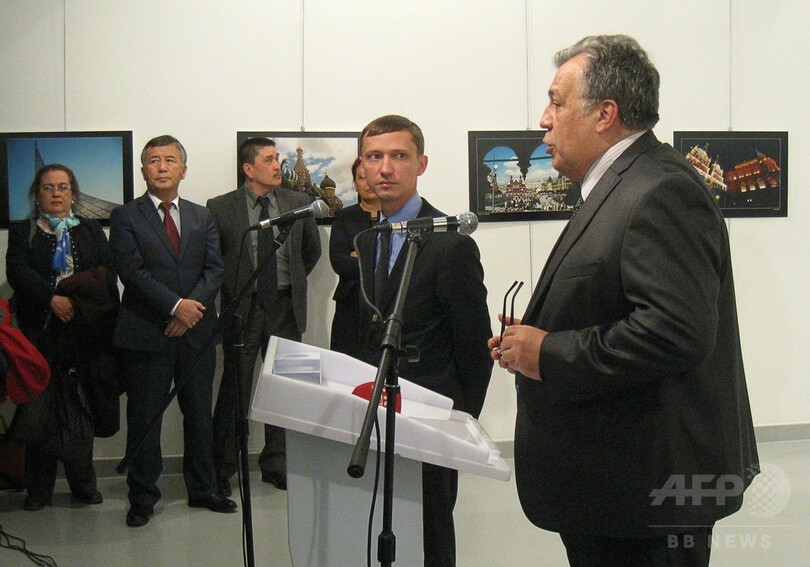 【12月20日 AFP】(更新、写真追加)トルコの首都アンカラ(Ankara)で開かれていた展覧会の会場で19日、ロシアのアンドレイ・カルロフ(Andrei Karlov)駐トルコ大使が警察官の男に撃たれ、死亡した。男は「アレッポ(Aleppo)」や「アッラー・アクバル(神は偉大なり)」などと叫んでいたとされ、ロシア政府は事件を「テロ」と断定した。