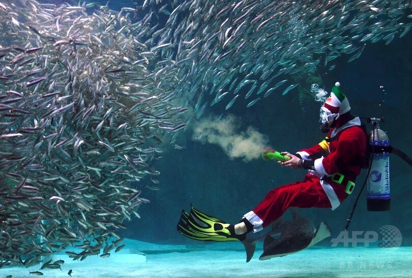 【12月20日 AFP】韓国・ソウル(Seoul)にある水族館「コエックス・アクアリウム(Coex Aquarium)」で17日、サンタクロースの衣装を着たダイバーが水槽の中で魚とともにクリスマスの特別パフォーマンスを行った。