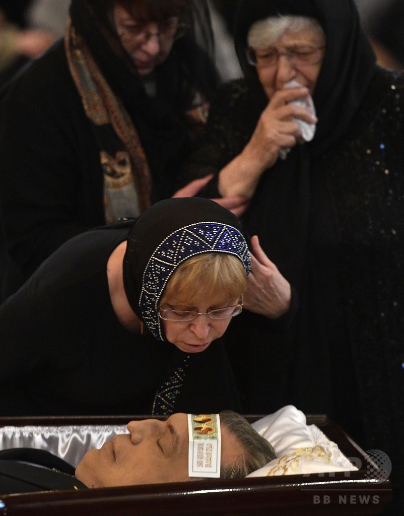 ロシアの首都モスクワの救世主ハリストス大聖堂で行われた葬儀で、アンドレイ・カルロフ駐トルコ大使の遺体と対面する同大使の妻(2016年12月22日撮影)。(c)AFP/Alexander NEMENOV