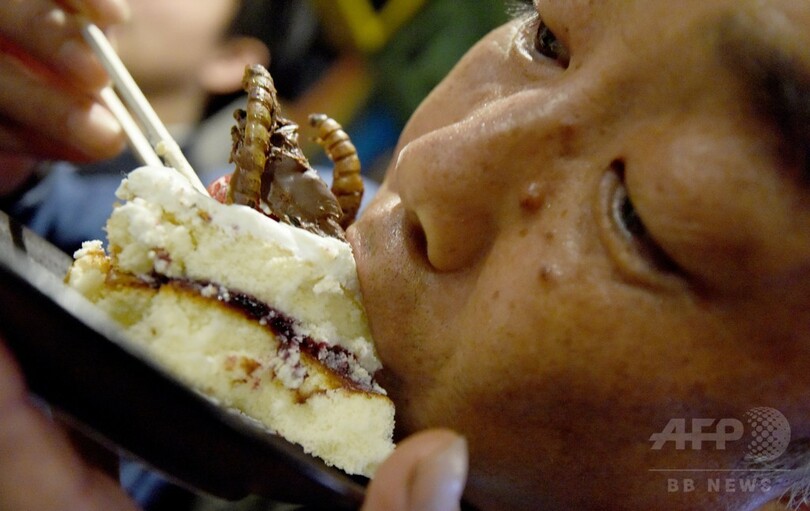 【12月25日 AFP】都内で24日、昆虫食を楽しむグループによるクリスマスイベントが開催された。30人以上の参加者らがチョコレートでコーティングされたセミやイモムシが載ったクリスマスケーキや、揚げたバッタがトッピングされているカナッペに舌鼓を打った。(c)AFP