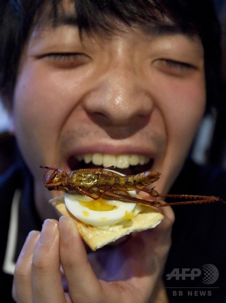 【12月25日 AFP】都内で24日、昆虫食を楽しむグループによるクリスマスイベントが開催された。30人以上の参加者らがチョコレートでコーティングされたセミやイモムシが載ったクリスマスケーキや、揚げたバッタがトッピングされているカナッペに舌鼓を打った。(c)AFP