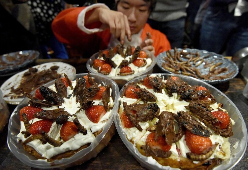 【12月25日 AFP】都内で24日、昆虫食を楽しむグループによるクリスマスイベントが開催された。30人以上の参加者らがチョコレートでコーティングされたセミやイモムシが載ったクリスマスケーキや、揚げたバッタがトッピングされているカナッペに舌鼓を打った。(c)AFP