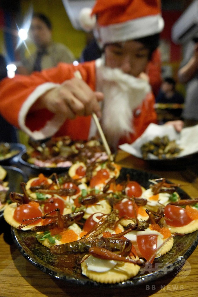【12月25日 AFP】都内で24日、昆虫食を楽しむグループによるクリスマスイベントが開催された。30人以上の参加者らがチョコレートでコーティングされたセミやイモムシが載ったクリスマスケーキや、揚げたバッタがトッピングされているカナッペに舌鼓を打った。(c)AFP