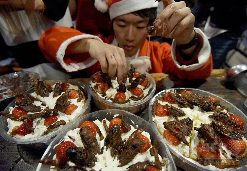 【12月25日 AFP】都内で24日、昆虫食を楽しむグループによるクリスマスイベントが開催された。30人以上の参加者らがチョコレートでコーティングされたセミやイモムシが載ったクリスマスケーキや、揚げたバッタがトッピングされているカナッペに舌鼓を打った。(c)AFP