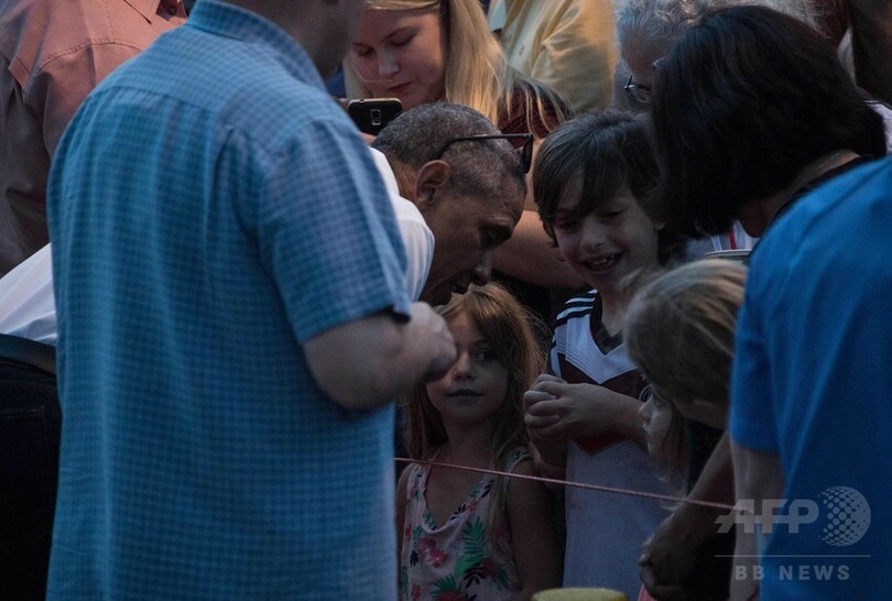 無事に密室から脱出したオバマ親子はその後、地元名物のかき氷に舌鼓を打ちつつ、予想外の訪問に驚いた人々と握手を交わしていた。(c)AFP