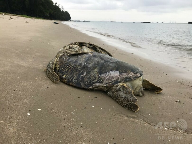 【1月4日 AFP】(写真追加)絶滅危惧種の巨大なウミガメが、シンガポールの砂浜で死んでいるのが発見された。死骸を発見した男性と専門家らが3日に語ったところによると、ウミガメは甲羅が半分に割れており、船のスクリューに当たった可能性が高いという。