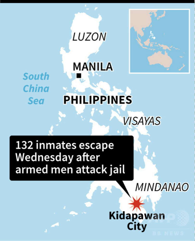 現場は同州キダパワン(Kidapawan)市にある刑務所。受刑者1511人を収容し、守衛24人が配置された同刑務所に100人を超える男が攻撃を仕掛け、2時間にわたる銃撃戦となった。