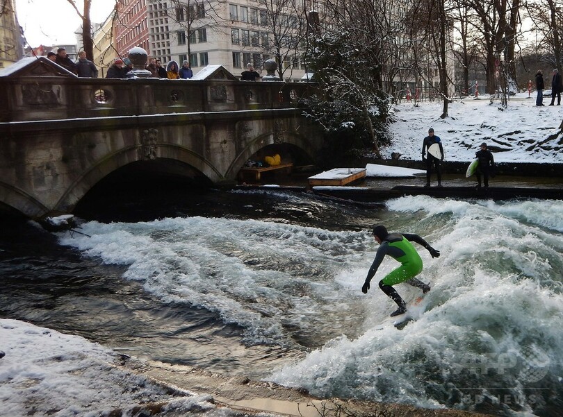 【1月6日 AFP】ドイツ南部ミュンヘン(Munich)は海から500キロ以上も離れているが、英国庭園(English Garden)内を流れるイザール川(Isar River)の支流アイスバッハ(Eisbach)はサーフィンの名所として知られ、真冬でも多くのサーファーたちが極寒をものともせずにサーフィンに興じている。
