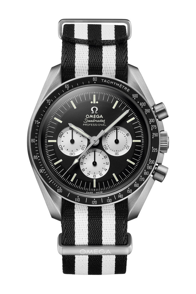 デザインのベースとなったのは、1978 年にアメリカ航空宇宙局(NASA)用に作られた「スピードマスター “アラスカ プロジェクト Ⅲ” モデル」。マットなブラッシュ仕上げのステンレススティール製ケースと、大きめの数字を放射状に配置した“ラディアル サブダイアル”を再現した。さらに、ダイアルのデザインには1966 年に初登場した「逆パンダ」ダイアルを採用し、ダイアル上にはヴィンテージのオメガロゴを配した。