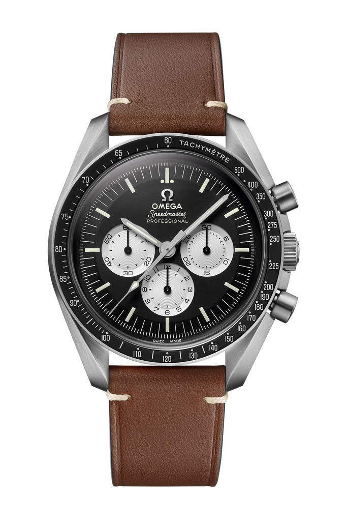 デザインのベースとなったのは、1978 年にアメリカ航空宇宙局(NASA)用に作られた「スピードマスター “アラスカ プロジェクト Ⅲ” モデル」。マットなブラッシュ仕上げのステンレススティール製ケースと、大きめの数字を放射状に配置した“ラディアル サブダイアル”を再現した。さらに、ダイアルのデザインには1966 年に初登場した「逆パンダ」ダイアルを採用し、ダイアル上にはヴィンテージのオメガロゴを配した。