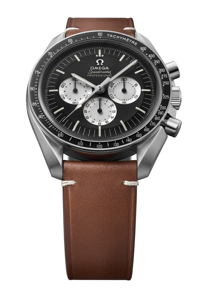 デザインのベースとなったのは、1978 年にアメリカ航空宇宙局(NASA)用に作られた「スピードマスター “アラスカ プロジェクト Ⅲ” モデル」。マットなブラッシュ仕上げのステンレススティール製ケースと、大きめの数字を放射状に配置した“ラディアル サブダイアル”を再現した。さらに、ダイアルのデザインには1966 年に初登場した「逆パンダ」ダイアルを採用し、ダイアル上にはヴィンテージのオメガロゴを配した。