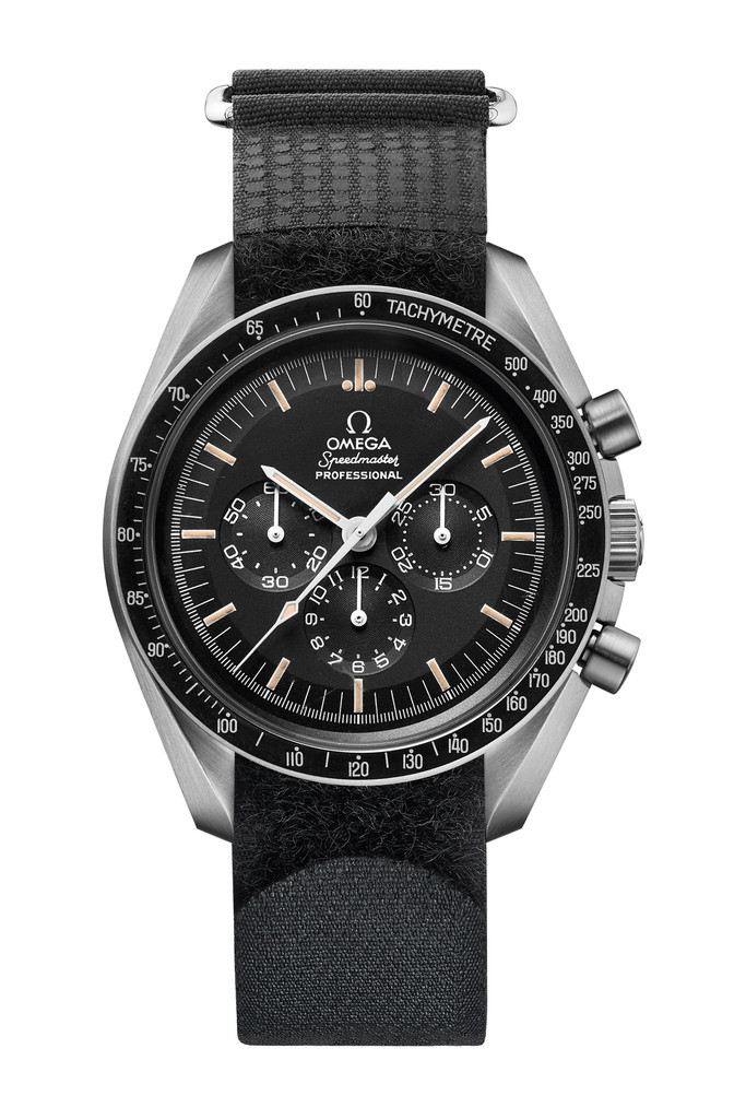 デザインのベースとなったのは、1978 年にアメリカ航空宇宙局(NASA)用に作られた「スピードマスター “アラスカ プロジェクト Ⅲ” モデル」。マットなブラッシュ仕上げのステンレススティール製ケースと、大きめの数字を放射状に配置した“ラディアル サブダイアル”を再現した。さらに、ダイアルのデザインには1966 年に初登場した「逆パンダ」ダイアルを採用し、ダイアル上にはヴィンテージのオメガロゴを配した。