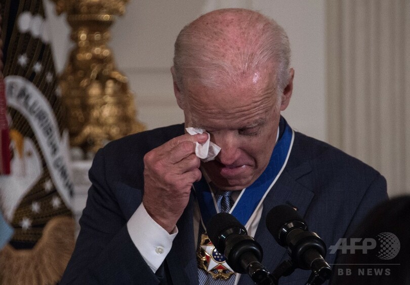 バイデン氏は驚いた表情を見せた後、出席者に背を向けて涙を拭った。そして「大統領、あなたに感謝しています。あなたの友情、あなたの家族に感謝しています」と述べた。(c)AFP